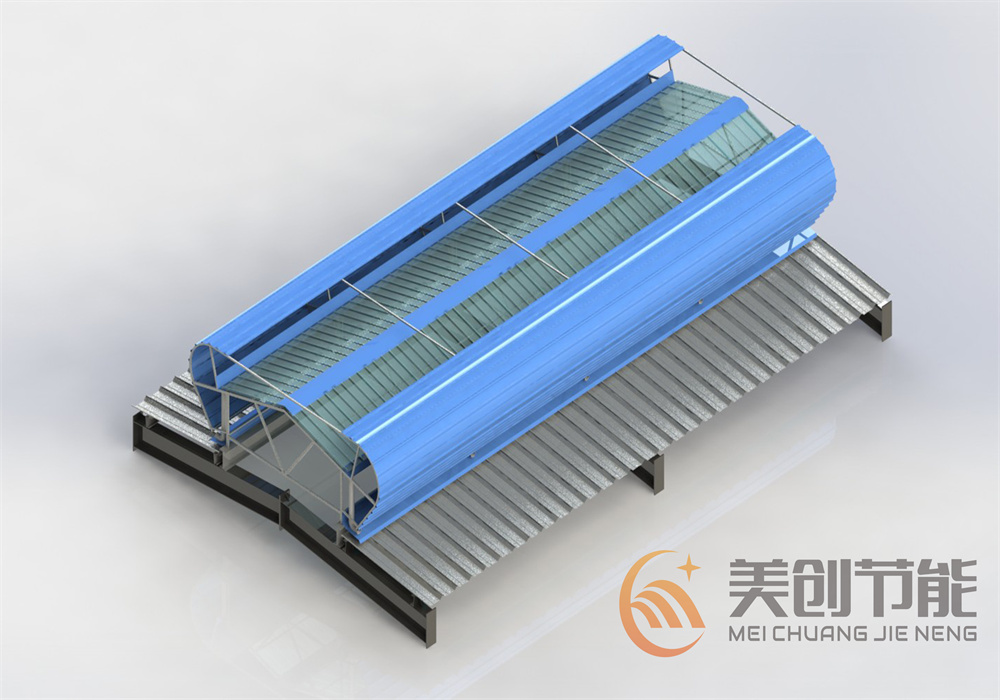 圓弧外觀,其結(jié)構(gòu)簡單合理,側(cè)面設(shè)計成圓弧形,有效減少風壓阻力,由骨架、外圍護板(擋風板)、擋雨板、排水槽、泛水板等部分組成,啟閉式可加裝啟閉機構(gòu)